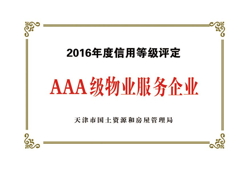 公司目前被授予:中國保安協(xié)會理事單位、物業(yè)管理綜合實力入圍企業(yè)、天津市物業(yè)協(xié)會理事單位、天津市保安協(xié)會常務理事單位、天津市保潔協(xié)會明星企業(yè)、天津市科技小巨人企業(yè)、天津市科技型企業(yè)、天津市物業(yè)管理企業(yè)優(yōu)秀項目經(jīng)理、企業(yè)信用評價體系A(chǔ)AA級企業(yè)、AAA級誠信經(jīng)營示范單位、AAA級重合同守信用單位、2017年被天津市工商業(yè)聯(lián)合會評為天津市民營企業(yè)促進就業(yè)百強企業(yè)、社會捐贈百強企業(yè)、2018年銷售收入百強企業(yè),2020年被天津市退役軍人事務局評為天津市吸納退役軍人就業(yè)先進單位。
